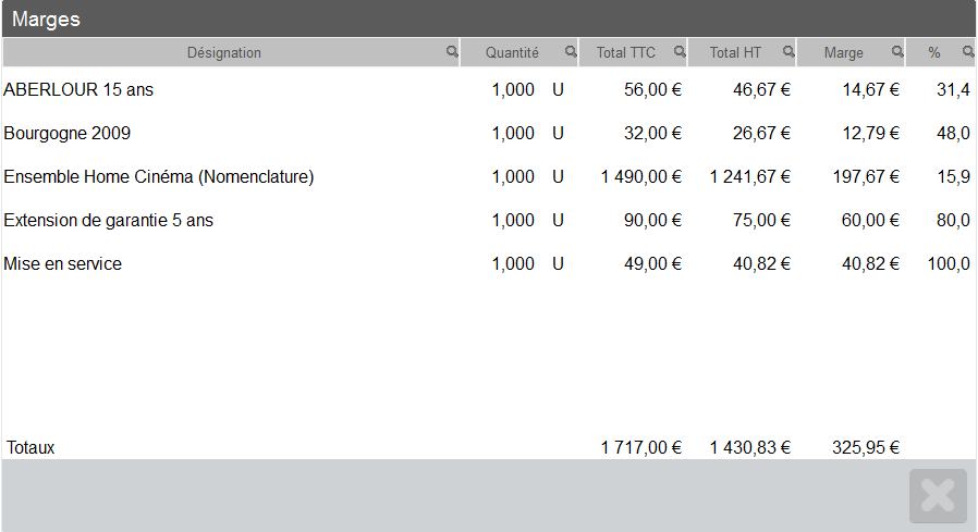 Pour les articles nomenclaturés, la marge est affichée pour l'article principale et non pour ses composants