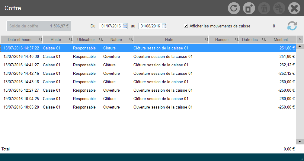 Chaque mouvement est enregistré, quand vous ouvrez une caisse, le montant saisi en fond de caisse est prélevé au coffre, quand vous clôturez le contenu du tiroir est remis dans son intégralité au coffre.