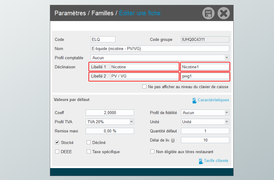 Libellé 1 : libellé du menu sur Prestashop ; code 1 : code unique (valable pour tous les articles classés dans cette famille)