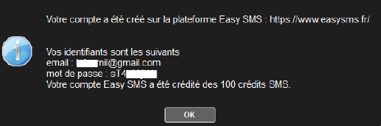 A la fin de la création, une notification interne est ajoutée dans les messages du Manager avec le login et mot de passe pour la plateforme EasySMS.